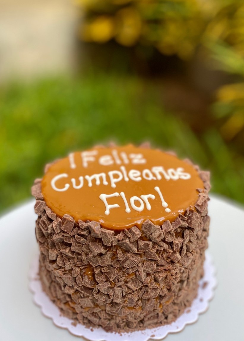 Deliciosa torta de queque vainilla rellena de manjar y bañada en manjar con trocitos de chocolate bitter.